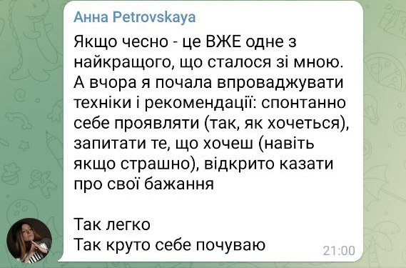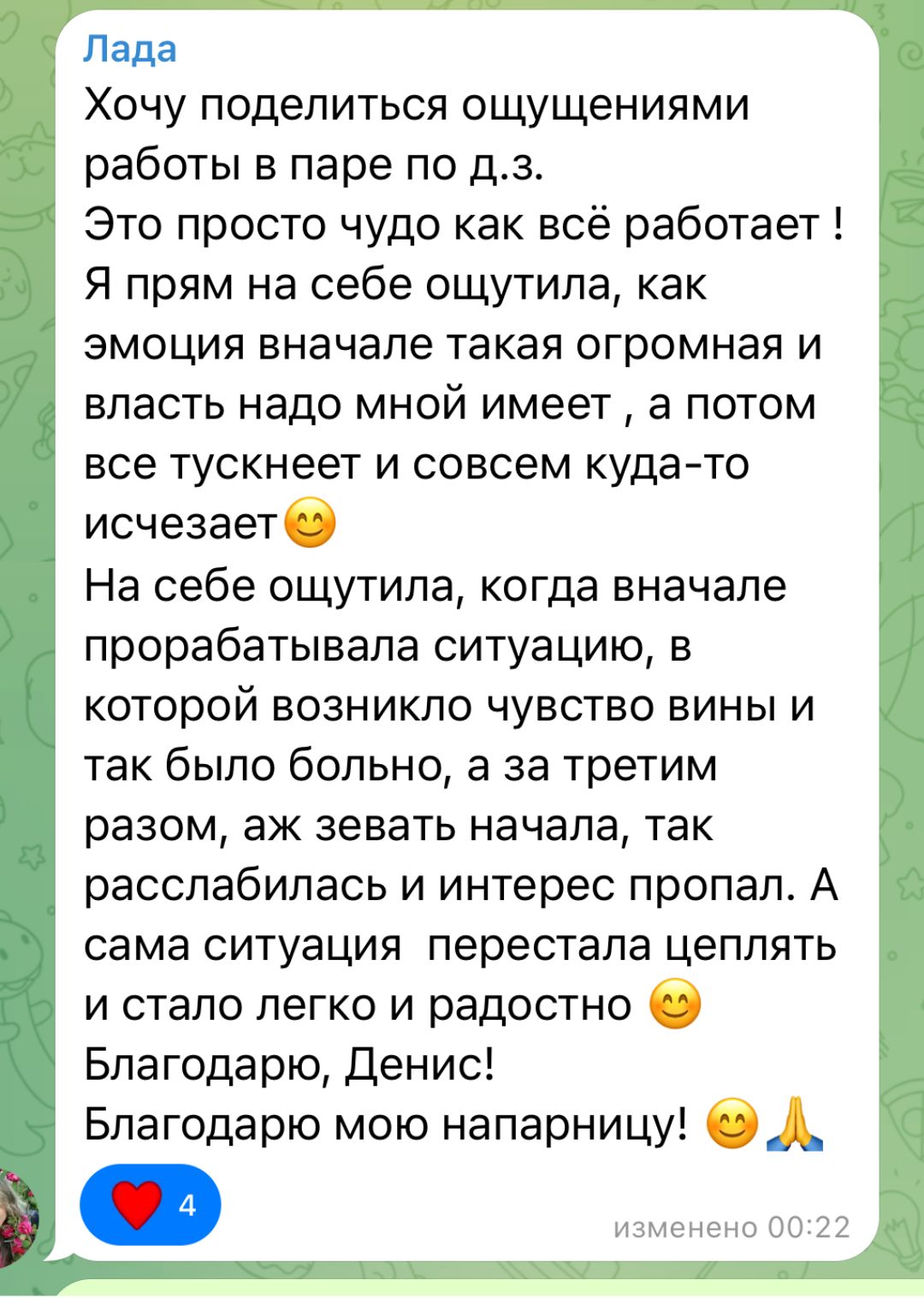 С помощью техник “Шарнир”, “Отпускание обиды”, “Исцеление травмы” и “Линия жизни” мы находим причину. То событие, в котором он научился так реагировать. Проживаем его, выпускаем эмоцию, и к человеку возвращается его истинная уверенность в себе. Убеждение, что со мной все в порядке и я знаю, чего действительно достоин.
