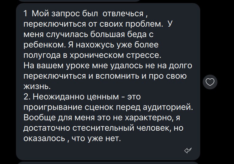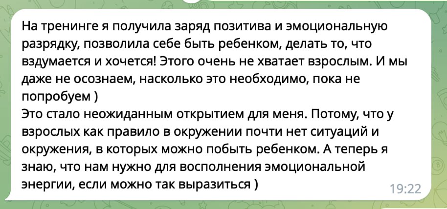 Это редкая возможность за 3 часа переключиться с привычных сценариев общения, от которых вам плохо, на новое взаимодействие, в котором вам хорошо.