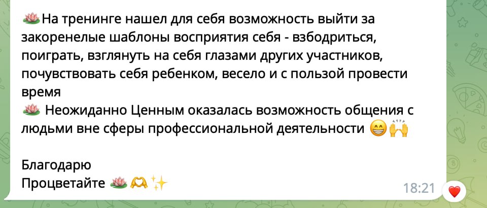 Вы выйдете с тренинга немного (или много) другими людьми. Как прежде уже не будет. Будет лучше.